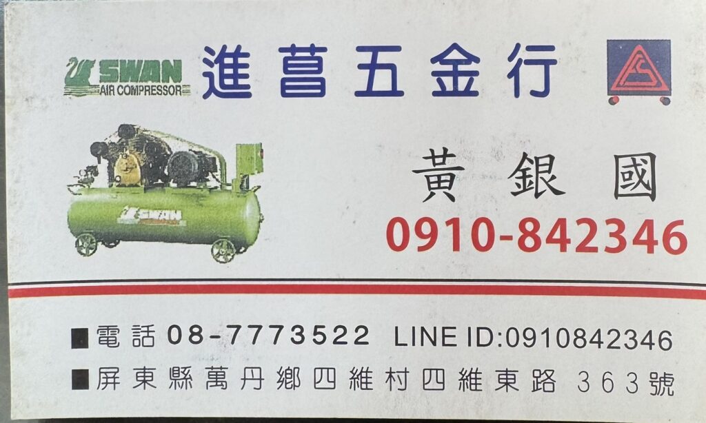 「進菖五金行」長期專注於空壓機維修與買賣,以及各類五金材料供應,憑藉專業技術與誠信經營,在地方建立穩固口碑。黃銀國先生以豐富的實務經驗,提供客戶精準且高效率的服務,無論是在設備維護或產品選購方面,皆深受業界與顧客肯定,為萬丹地區重要的產業後勤支援力量。
