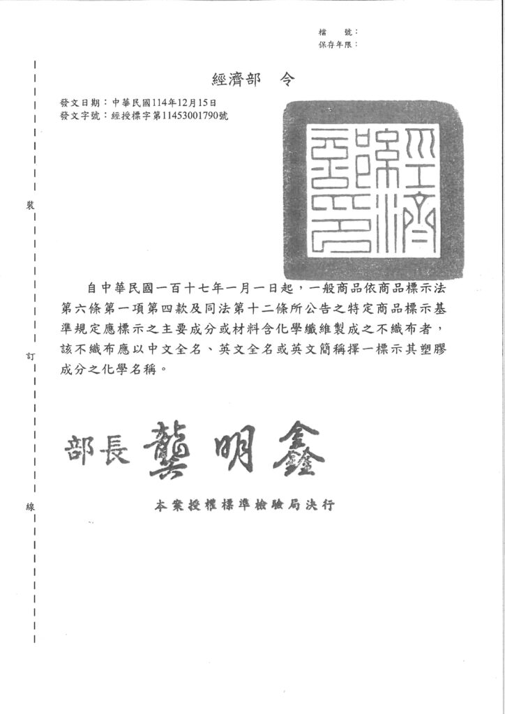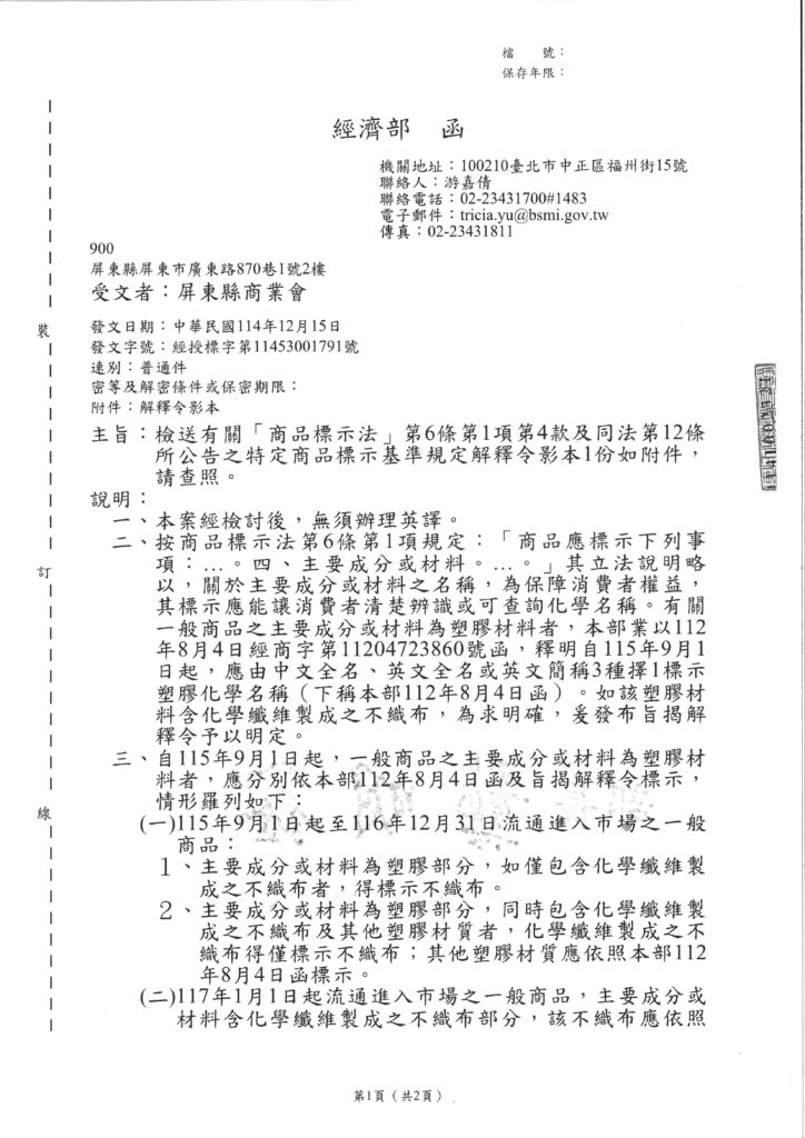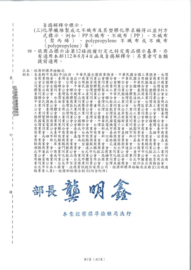 「商品標示法」第6條第1項第4款及同法第12條所公告之特定商品標示基準規定解釋令。/