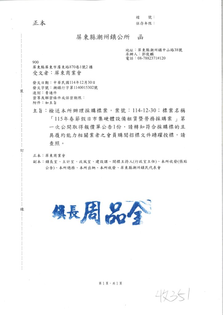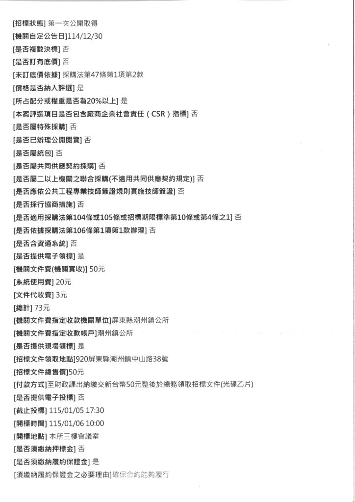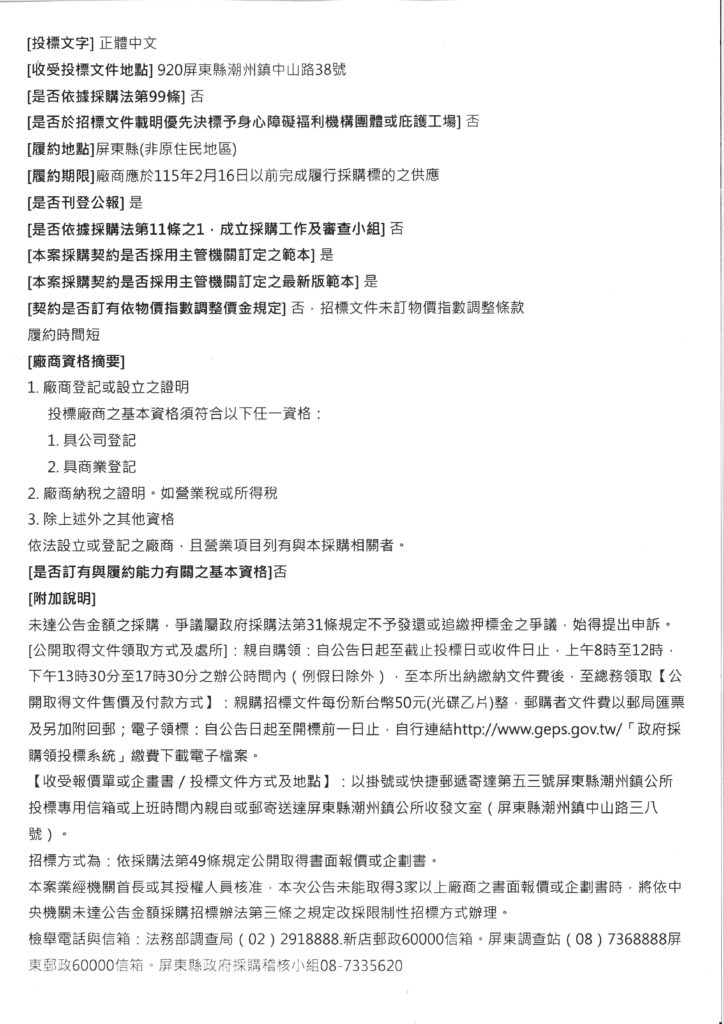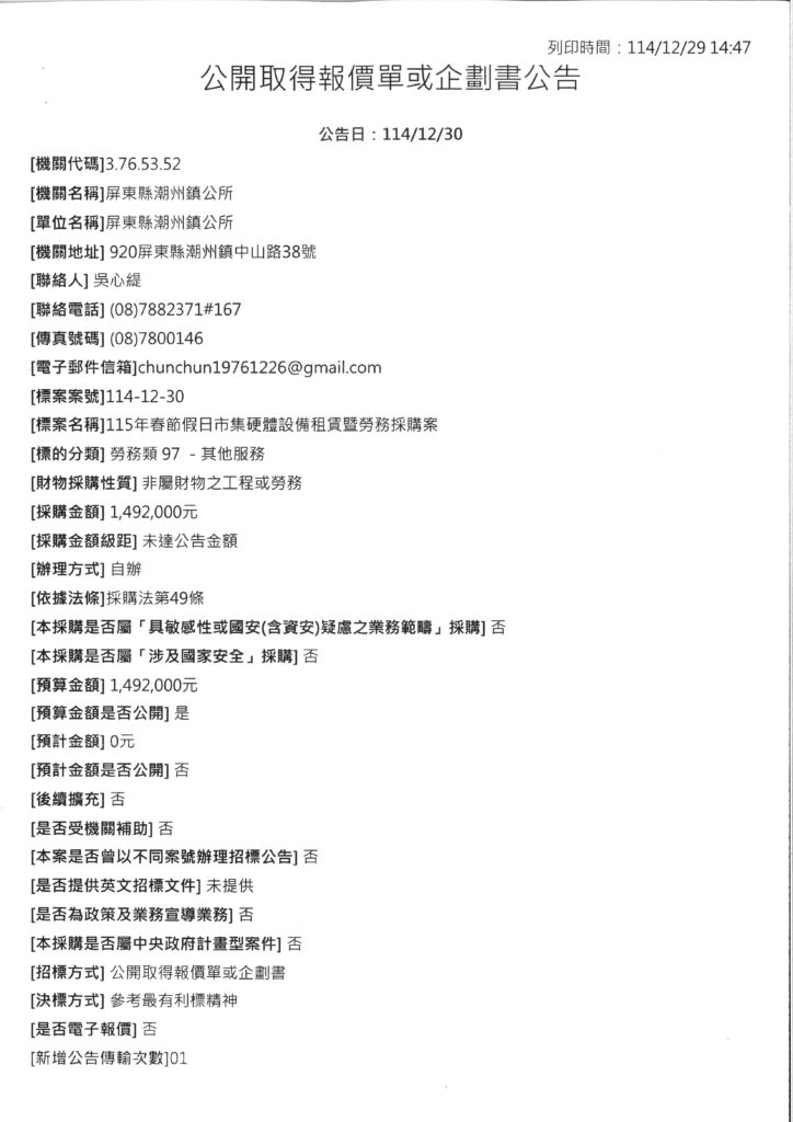 潮州鎮公所辦理「115年春節假日市集硬體設備租賃暨勞務採購案」