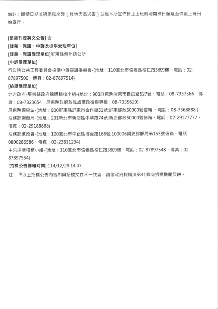 115年度屏東縣潮州鎮共所病媒蚊防治噴藥服務工作勞務採購案。