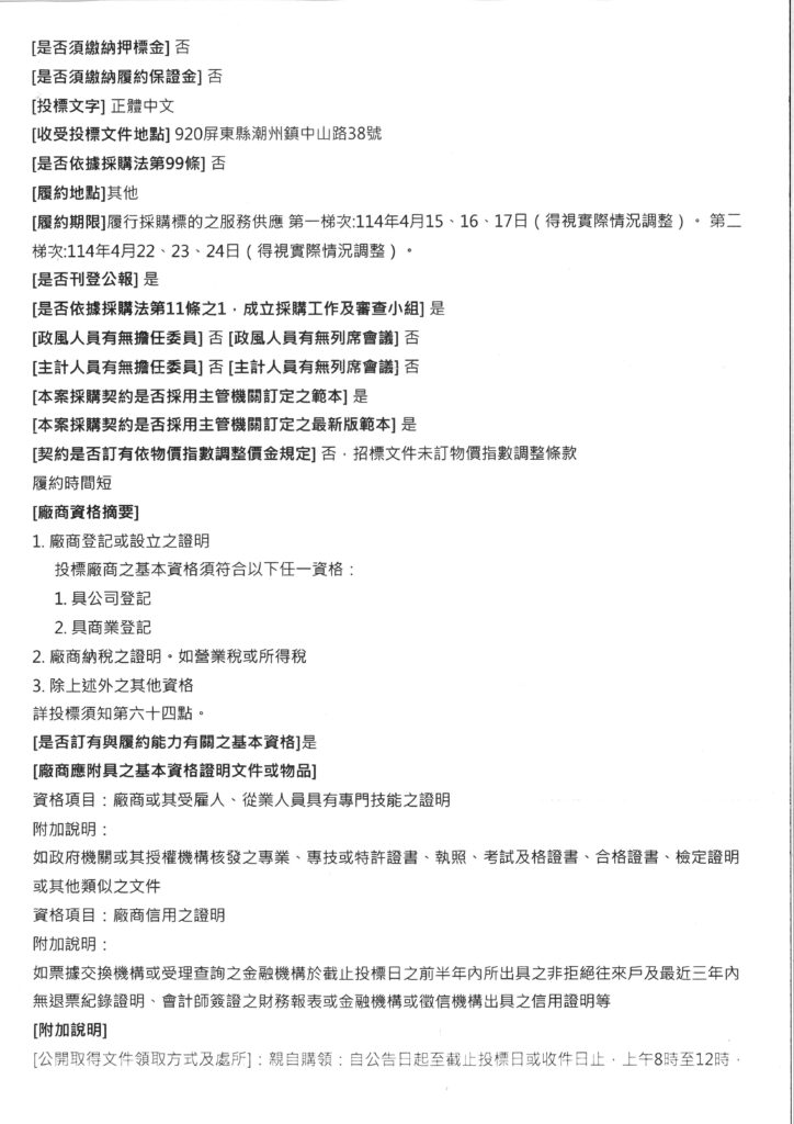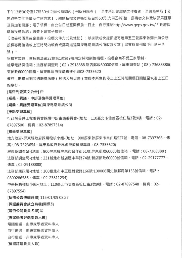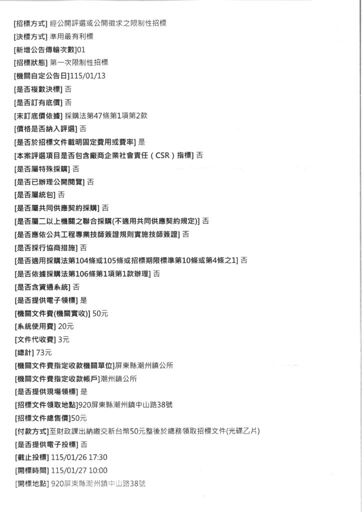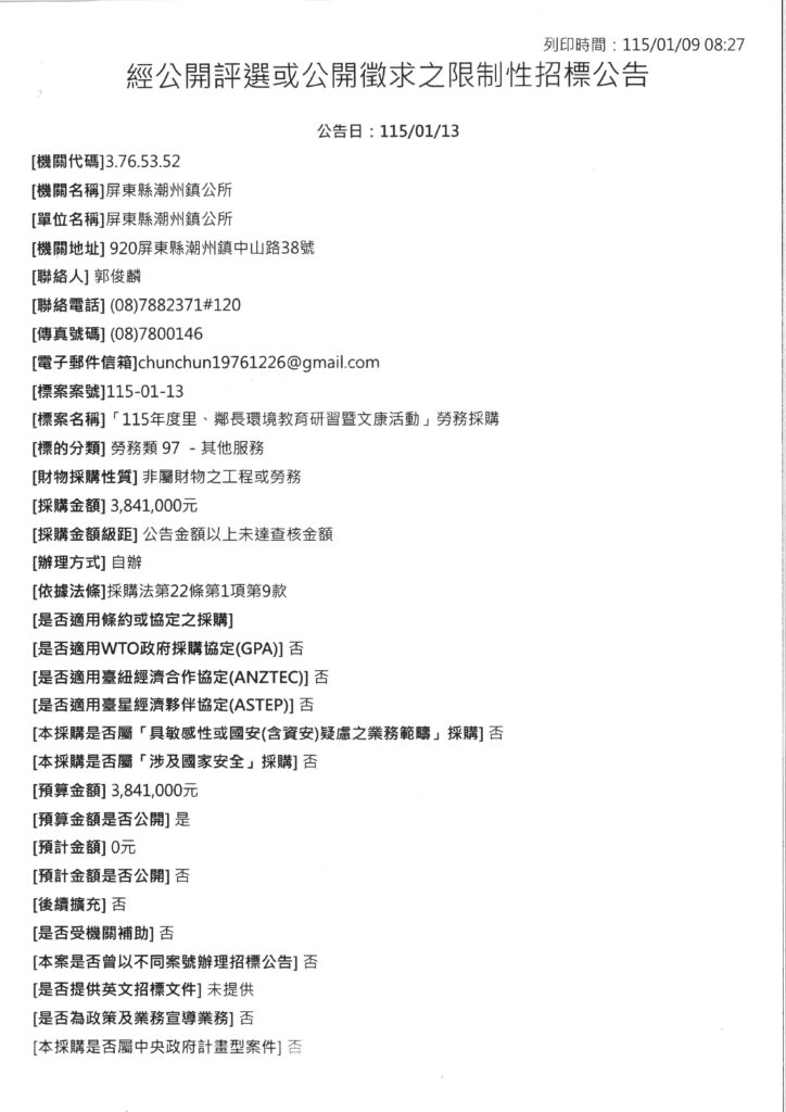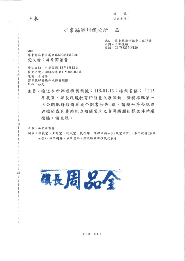 潮州鎮公所辦理採購標案,案號:115-01-13;名稱:「115年度里、鄰長環境教育研習暨文康活動」勞務採購