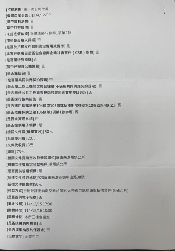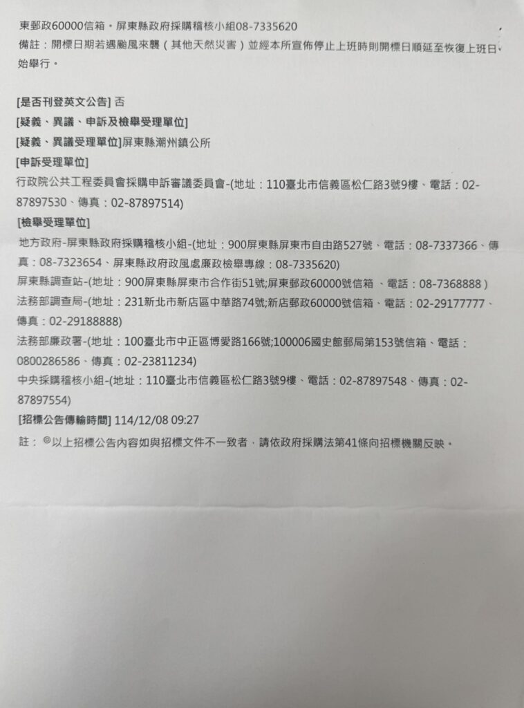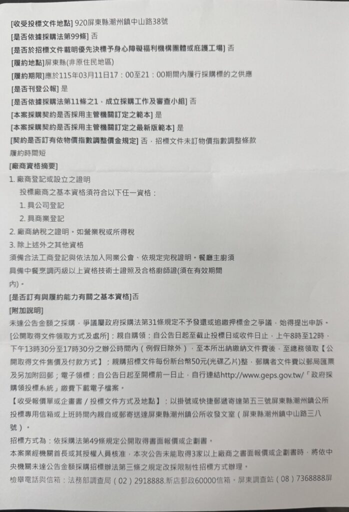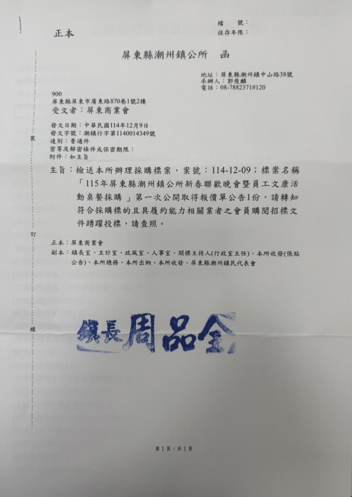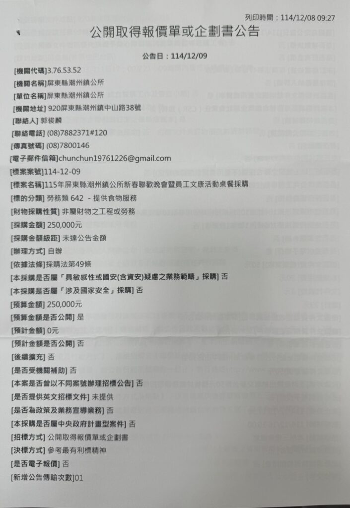 潮州鎮公所辦理採購標案,案號:114-12-09;標案名稱「115年屏東縣潮州鎮公所新春聯歡晚會暨員工文康活動桌餐採購」/
