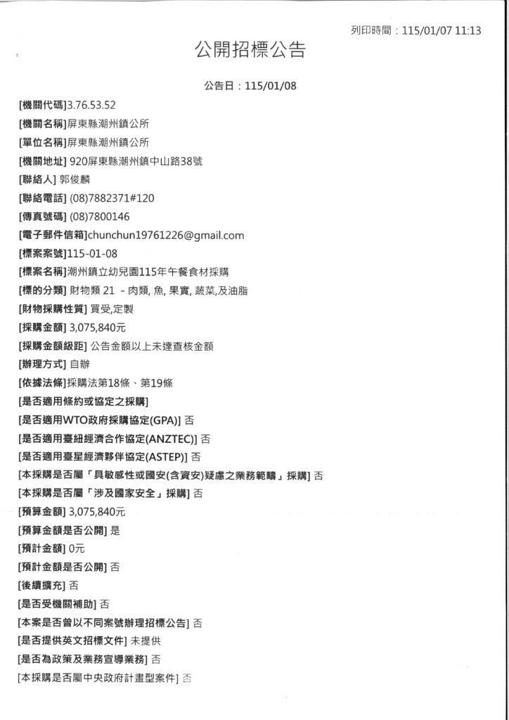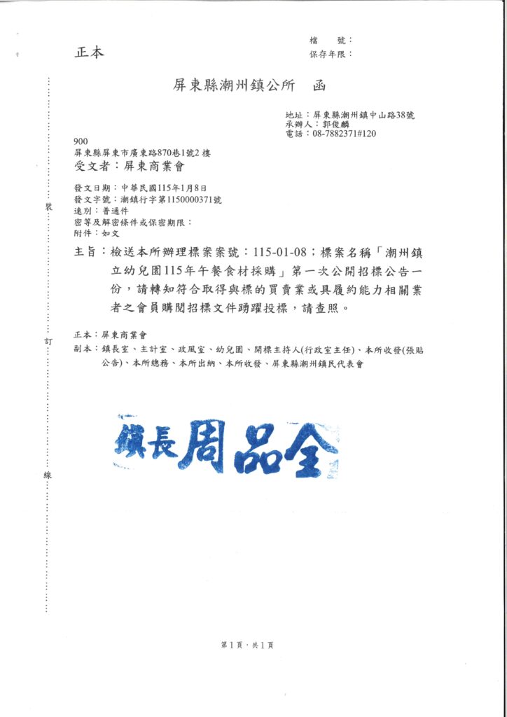 潮州鎮利幼兒園115年午餐食材採購案