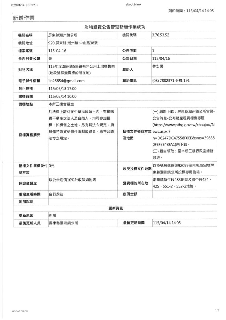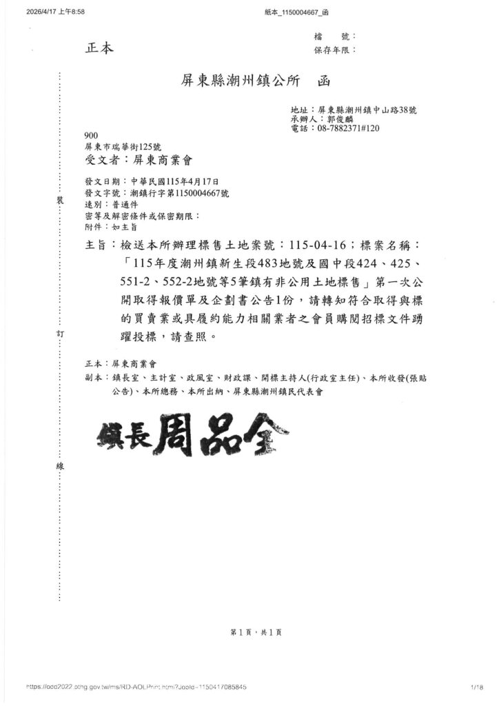 二、旨案係潮州鎮公所辦理標售土地案號:115-04-16;標案名稱:「115年度潮州鎮新生段483地號及國中段424、425、551-2、552-2地號等5筆鎮有非公用土地標售」第一次公開取得報價單及企劃書公告1份,請本會轉知會員購月招標文件踴躍投標。