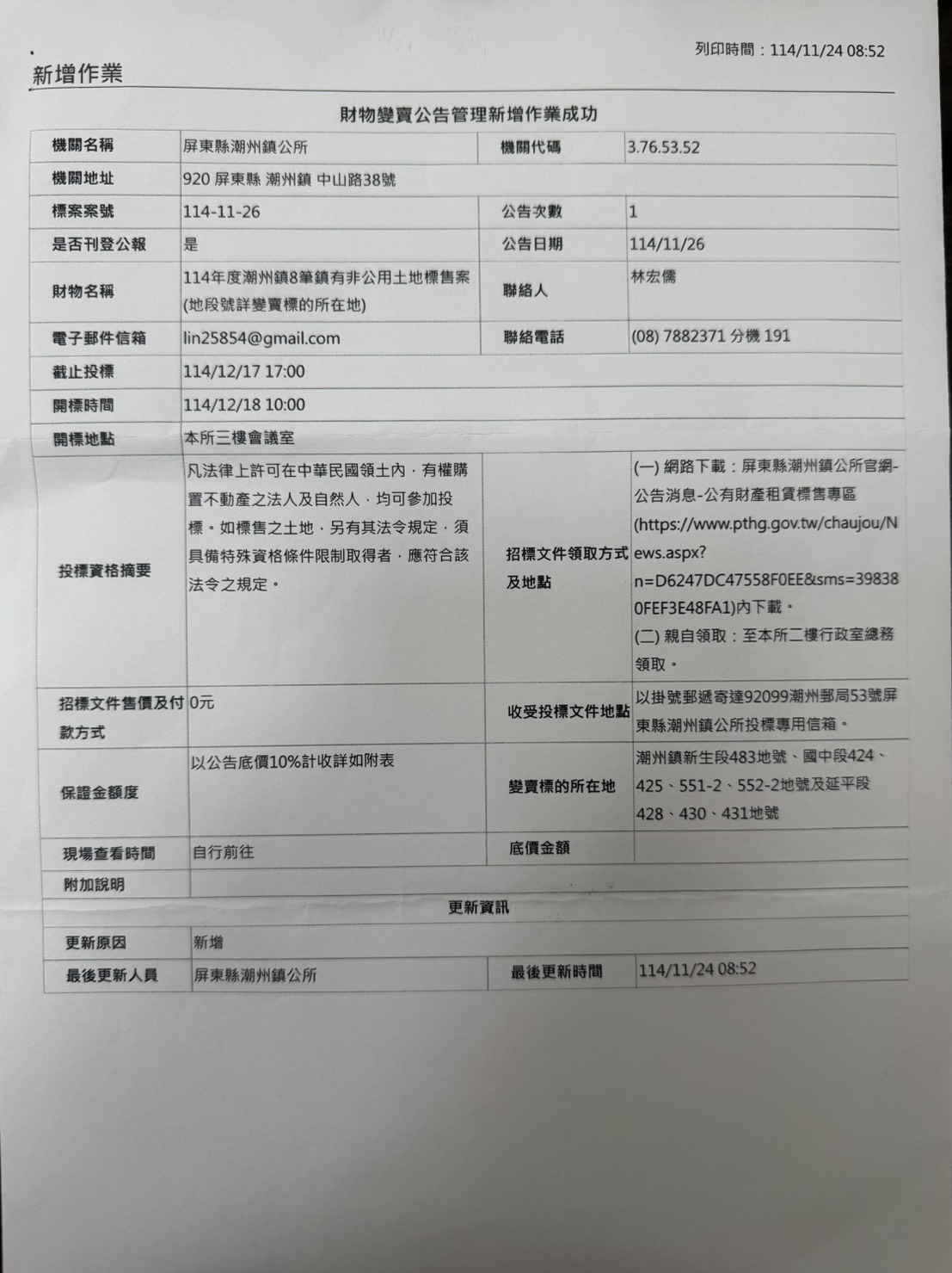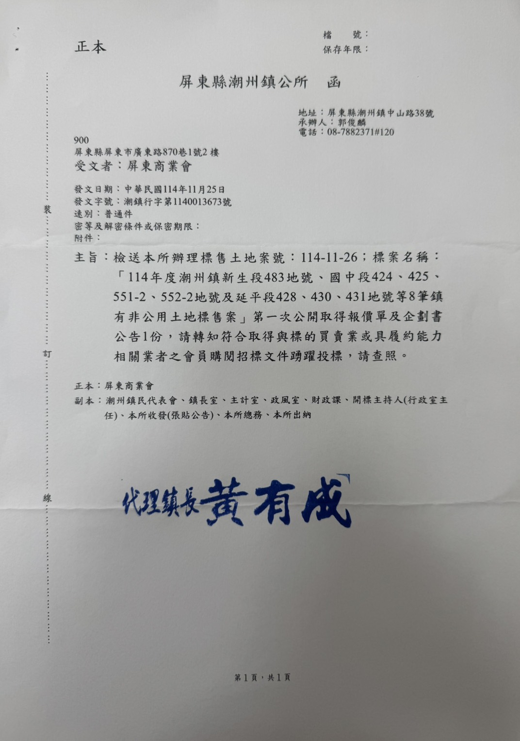 秘書室報告:潮州鎮公所函送辦理標售土地案號:114-11-26(如附件),請本會轉知所屬踴躍投票。