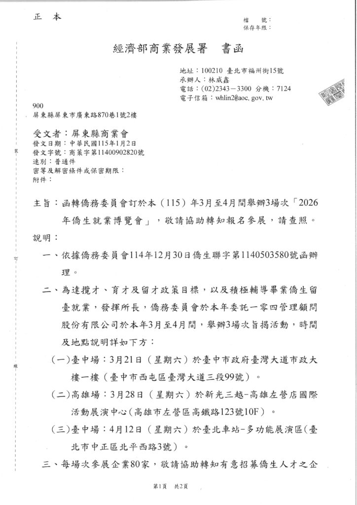 經濟部商業發展署函轉「2026年僑生就業博覽會」有關事宜。