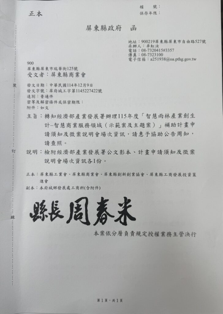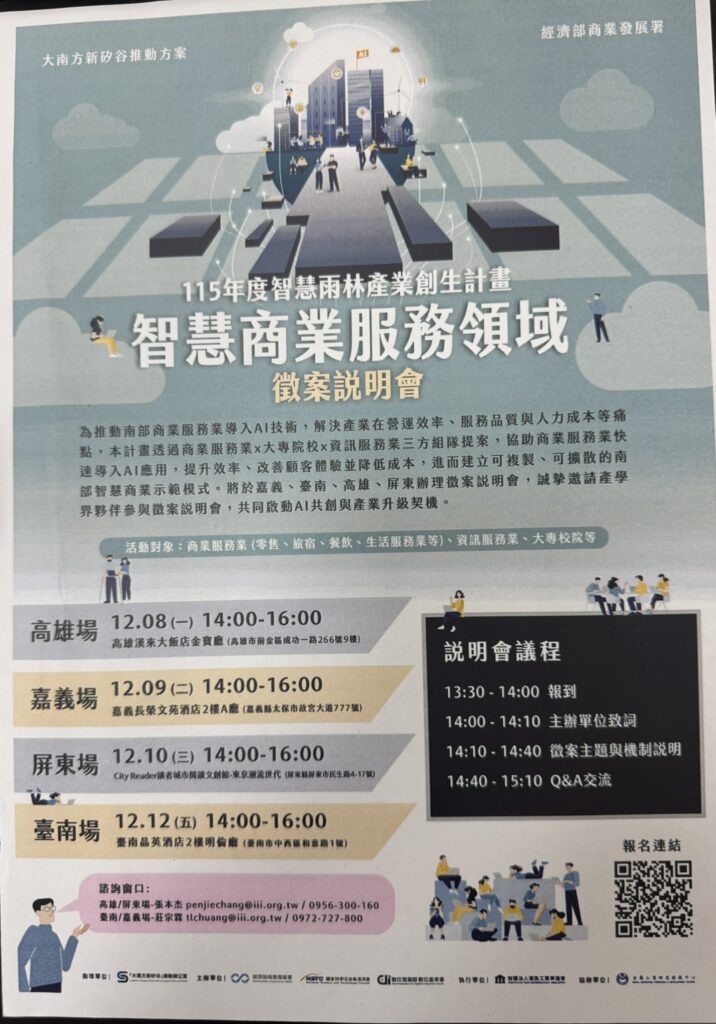 經濟部產業發展署115年度「智慧雨林產業創生計畫-智慧商業服務領域(示範案及主題案)」補助計畫申請須知及徵案說明會場次資訊。(補助計畫請逕至經濟部中小及新創企業署網站下載https://www.sme.gov.tw/article-tw-2275-13798)(說明會屏東場諮詢窗口:張本杰0956300160)/