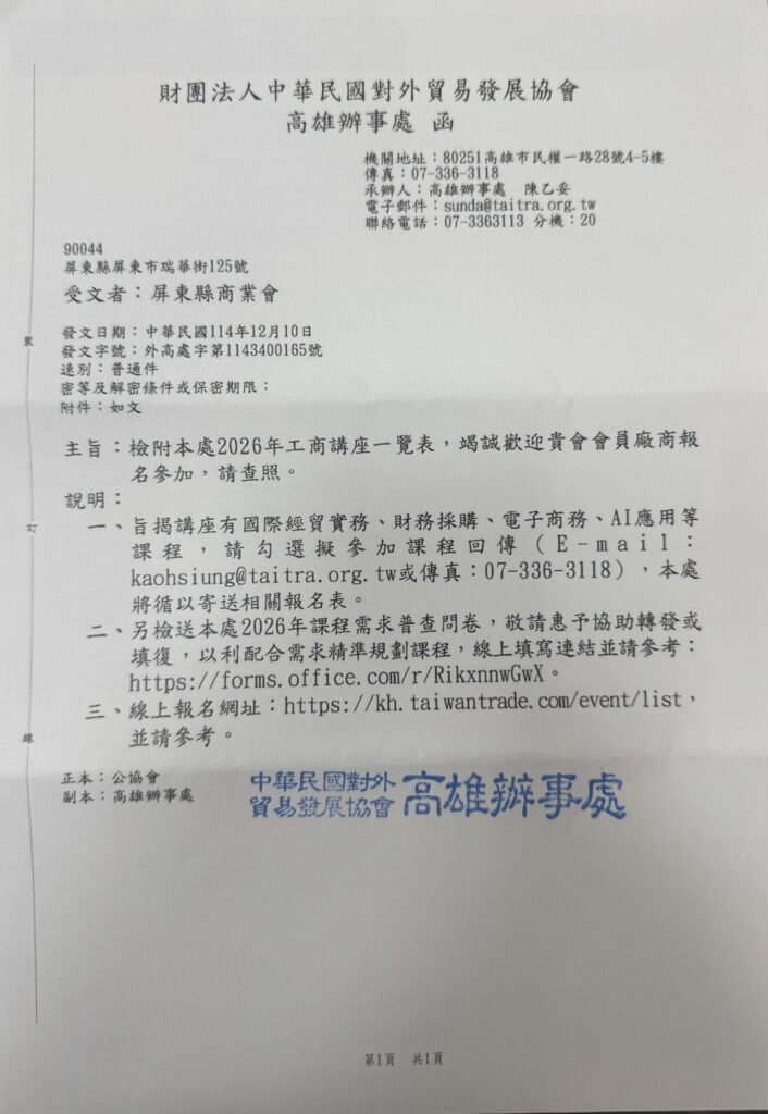 財團法人中華民國對外貿易發展協會高雄辦事處2026工商講座有關事宜。(線上報名請逕至網址:https://kh.taiwantrade.com/event/list)
