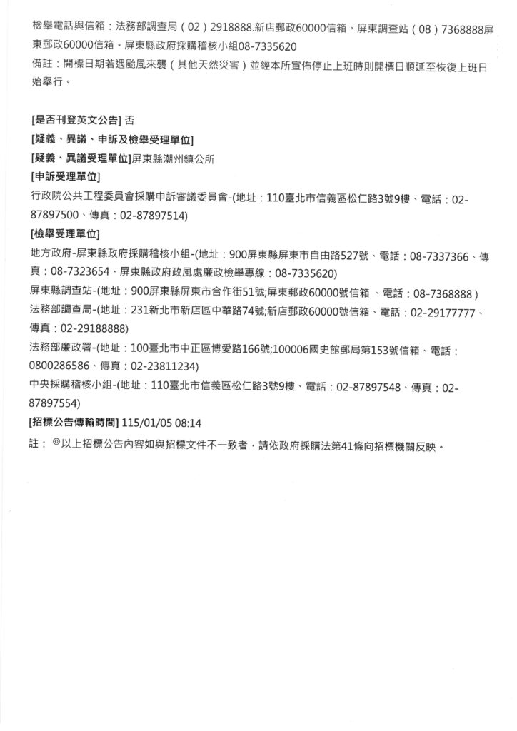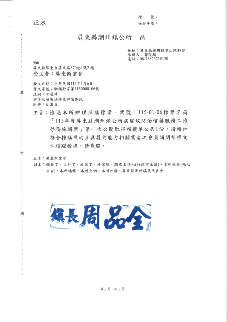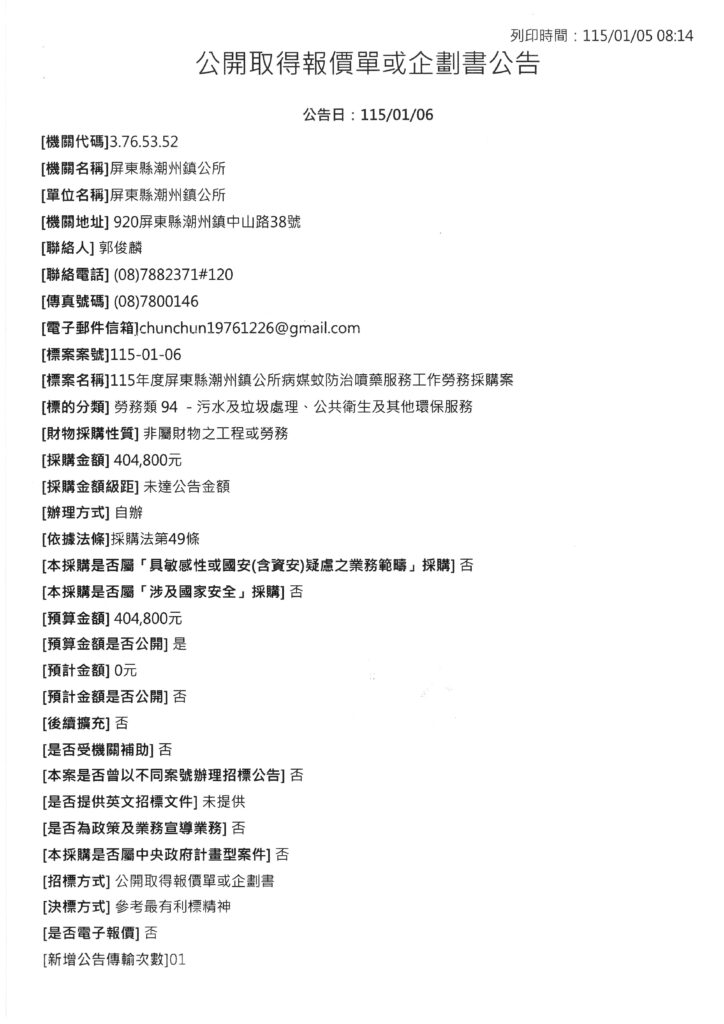 115年度屏東縣潮州鎮共所病媒蚊防治噴藥服務工作勞務採購案。