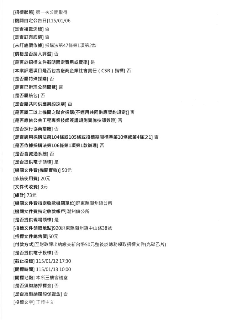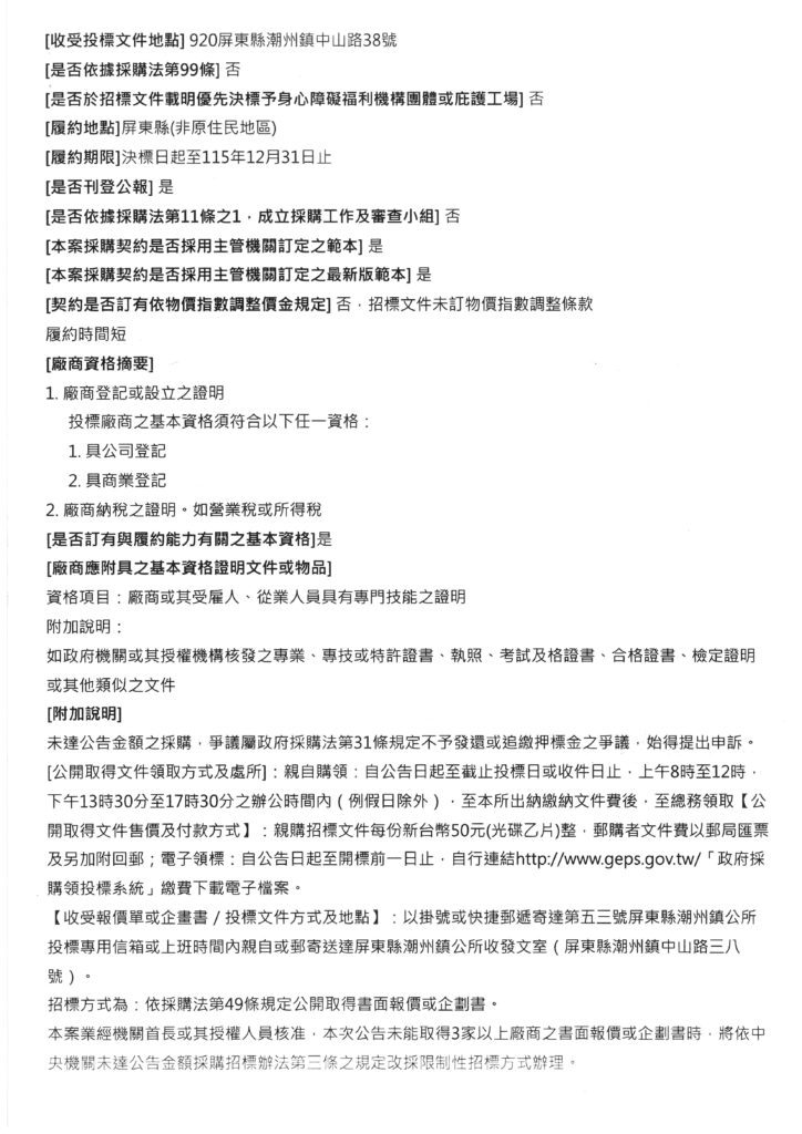 潮州鎮公所辦理「115年春節假日市集硬體設備租賃暨勞務採購案」