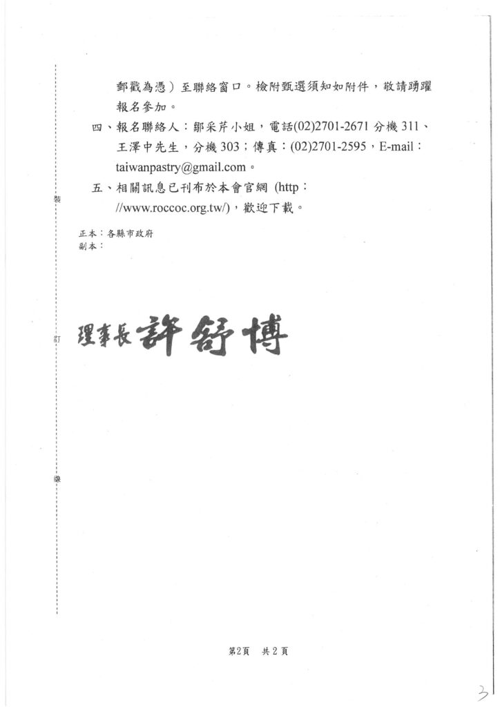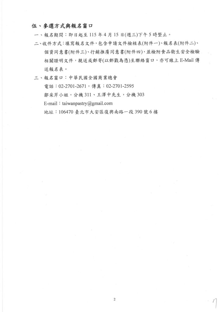 三、報名期間:自即日起至115年4月15日(星期三)下午5時整止。報名方式:填寫報名文件E-MAIL傳送或紙本郵寄(以郵戳為憑)至聯絡窗口。報名聯絡人:鄒采芹小姐,電話:(02)2701-2671分機311、王澤中先生,分機303;傳真(02)2701-2595,E-MAIL:taiwanpastry@gmail.com。